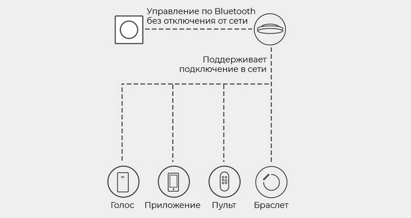 Выключатель Yeelight не размыкает электрическую сеть, а передает команды лампе по протоколу Bluetooth, благодаря этому светильник не пропадает из сети и может одновременно управлять голосовыми командами или через приложение.