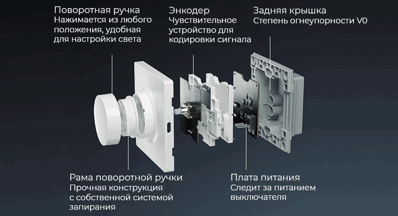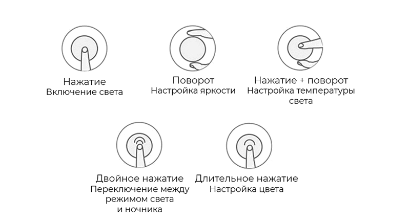 Полноценное управление умными лампами с помощью одного выключателя. Диммер можно поворачивать, нажимать, нажимать и поворачивать — каждое действие отвечает за различные настройки освещения.