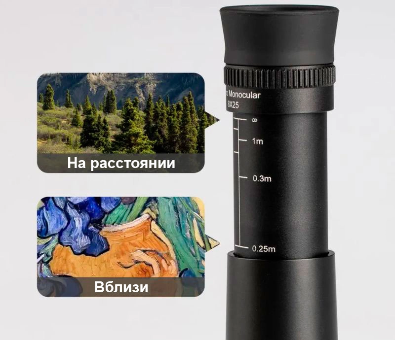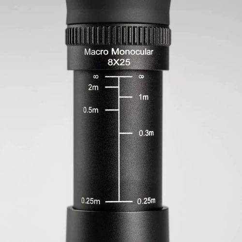 Ближайший фокус 25 см, увеличение в 8 раз, объектив 25 мм для большого поля зрения, широкоугольный обзор с углом обзора 8,2°. Близкофокусный телескоп отлично подходит, как для близких, так и для дальних дистанций.