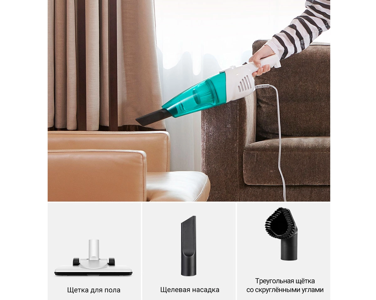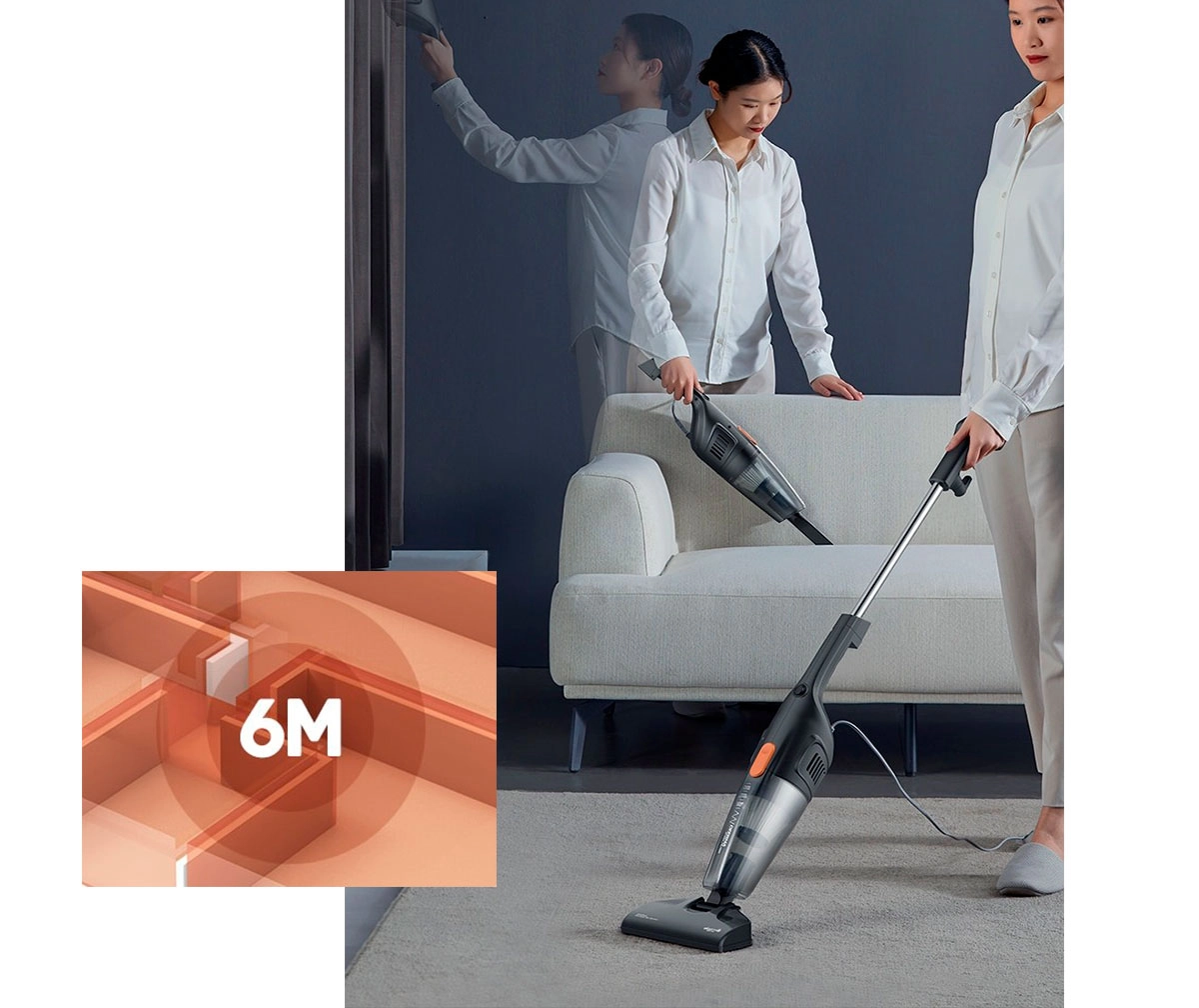 Использовать Deerma DX115C/DX118C можно в качестве напольного или ручного пылесоса. В сложенном виде его длина не превышает одного метра и с ним удобно убирать на полках, мягкой мебели и других местах на возвышении. При подключении рукоятки он превращается в полноценный напольный пылесос.
