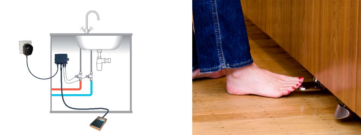 Еще одна интересная модель — это ножная педаль для подачи воды. При использовании педали кран всегда открыт, а если нужна вода, то нужно нажать ногой педаль, расположенную на полу. Принцип экономии тот же, что и в сенсорной насадке — вода не льется впустую, когда вы отходите или не используете ее. Производитель обещает сокращение расхода воды в 2 раза.