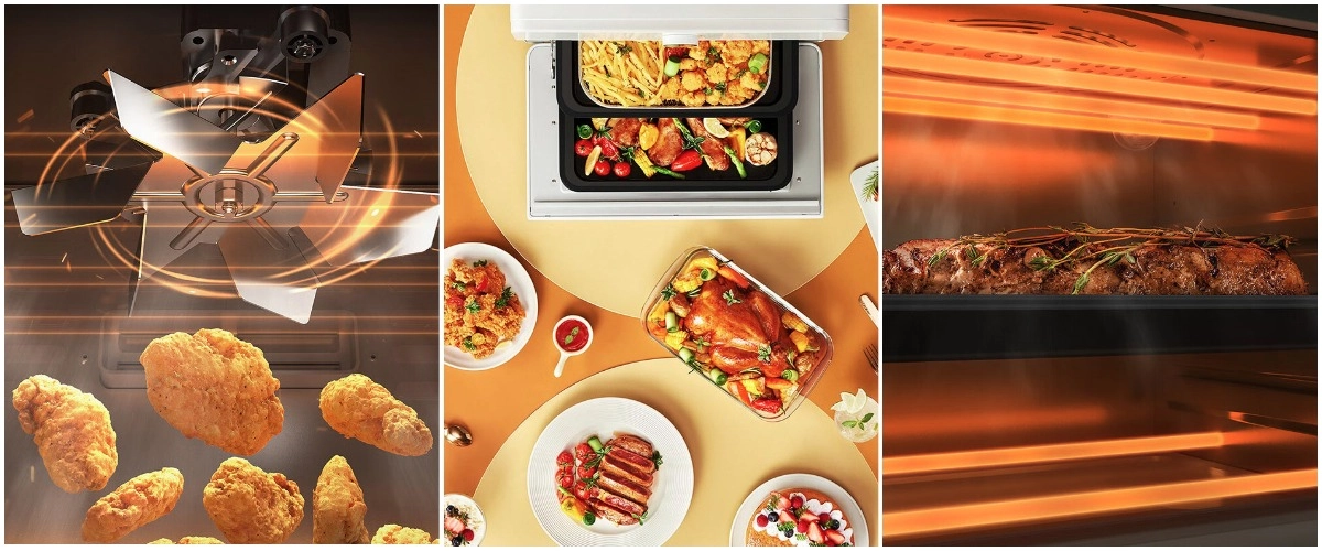 Вместимость печи 30 литров. У нее есть два противня для одновременной готовки на двух уровнях. За поддержание заданной температуры отвечают два встроенных датчика температуры. Верхний и нижний тэны имеют независимую регулировку нагрева для удобства приготовления еды на разных уровнях.