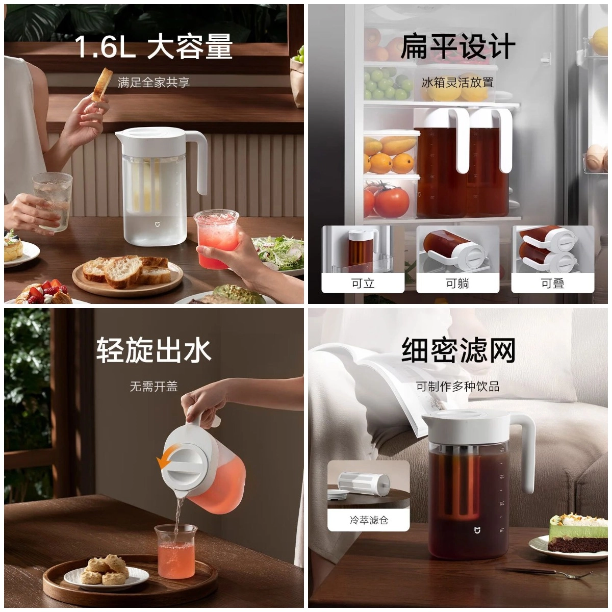 Xiaomi представила кувшин для холодных напитков продолговатой формы, который можно поставить на дверцу холодильника. Кувшин оснащен съемной сеточкой для трав или ягод и крышкой с удобной ручкой.