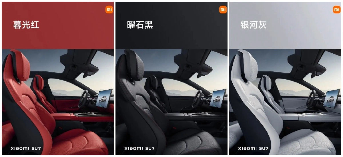 У Xiaomi SU7 классический круглый руль, сиденья в спортивном стиле и встроенная акустика с эффектом Dolby Audio. В линейке предлагается три цвета салона: космический серый, черный обсидиан и красные сумерки.
