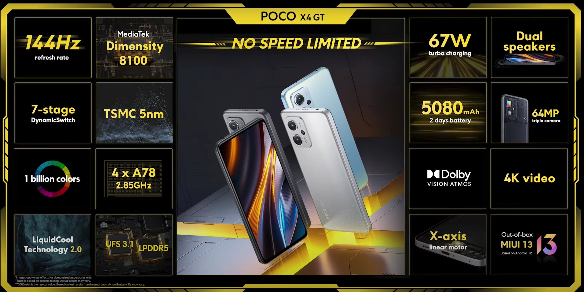 Poco X4 GT получил Full HD Plus дисплей с диагональю 6,6 дюймов. Высокая частота обновления экрана до 144 Гц и сенсор дискретизации с быстрым откликом делают игровой процесс еще более захватывающим. Две камеры фронтальная с разрешением 20 Мп и тыловая 64/8/2 Мп для съемок и стримов. Работает смартфон на платформе MediaTek Dimensity 8100 под управлением MIUI 13 на базе Android 12.