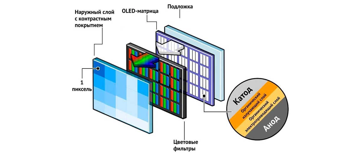 Этот тип дисплеев разработан компанией Kodak. Их отличает тонкость и низкое энергопотребления. Он состоит из нескольких слоев: черного фона, самой OLED матрицы, цветного фильтра и защитного стекла. В свою очередь OLED матрица тоже состоит из четырех слоев: катода и анода с двумя органическими слоями между ними — один излучающий слой, а второй электропроводящий. Когда на матрицу подается электрический заряд, то частицы начинают излучать свет и дополнительная подсветка не требуется, в отличие от ЖК-дисплеев. Черные пиксели просто обесточиваются и не расходуют энергию. OLED дисплеи могут быть, как плоскими, так и складными.