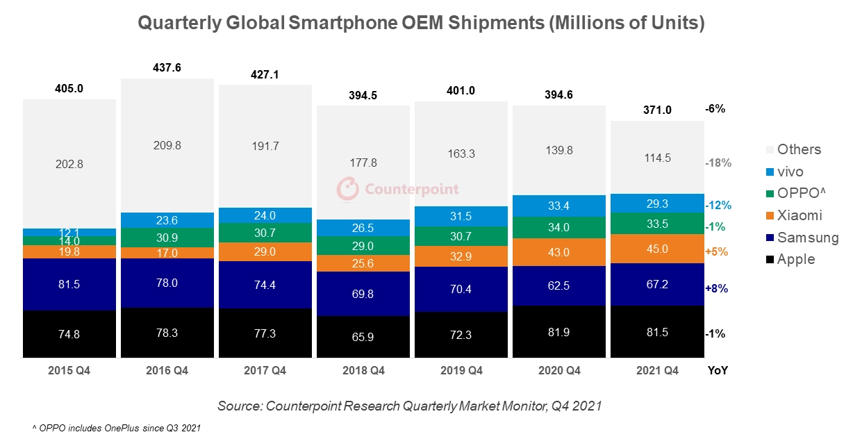 Статистика продаж последних лет показывает, что роста на рынке мобильных телефонов не было с 2017 года. И хотя, по сравнению с прошлым годом, прирост составил внушительные 4%, но рекорд 2017 года все равно не был побит. Тогда было продано 1,55 млдр единиц смартфонов. В 2021 году только 1,39 млдр. На уровень продаж влияет падение покупательского спроса, вызванное пандемией, а также сокращение поставок необходимых компонентов.