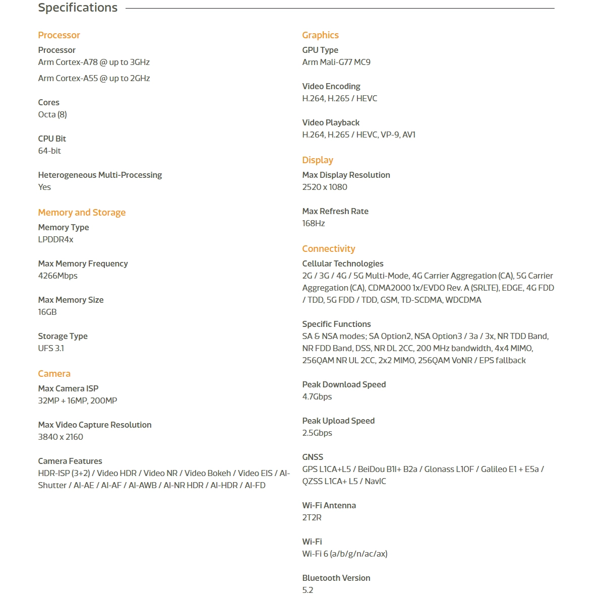 Платформа производится по 6 нанометровому техпроцессу с трехкластерным процессором. В восьмиядерном процессоре одно ядро работает с частотой до 3,0 ГГц, три на 2,6 ГГц, а еще четыре на частоте до 2,0 ГГц. За графику отвечает Arm Mali-G77 MC9.