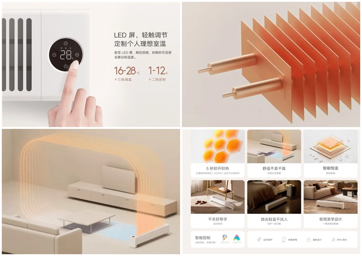 Обогреватель защищен от воды по стандарту IPX4, он не боится брызг воды и воды, пролитой на пол, так что его можно устанавливать и в ванной комнате. В верхней части у обогревателя расположен светодиодный сенсорный дисплей на котором можно выбрать комфортную температуру в диапазоне от 16 до 28 градусов, а также установить таймер на срок от 1 до 12 часов. Xiaomi MIJIA Graphene 2 поддерживает дистанционное управление через приложение и голосовое управление через ассистента XiaoAI.