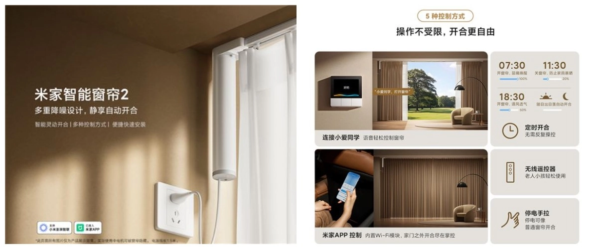 Xiaomi MIJIA Smart Curtain 2 может управляться с помощью приложения, голосового ассистента, пульта ДУ или работать по таймеру. Также никуда не делось и ручное открытие/закрытие штор.