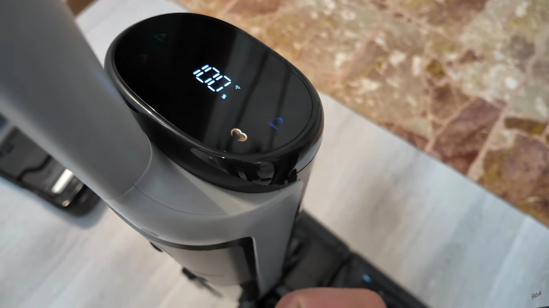 В торце корпуса расположен функциональный дисплей для быстрого доступа к настройкам пылесоса. Без приложения можно переключаться между режимами работы и отслеживать уровень загрязнения пола в режиме реального времени. Среди доступных для выбора режимов работы есть автоматический режим с автообнаружением грязи и регулировкой мощности всасывания, режим турбо для сухой уборки, пользовательский режим, который настраивается через приложение, и режим самоочистки и сушки щётки.