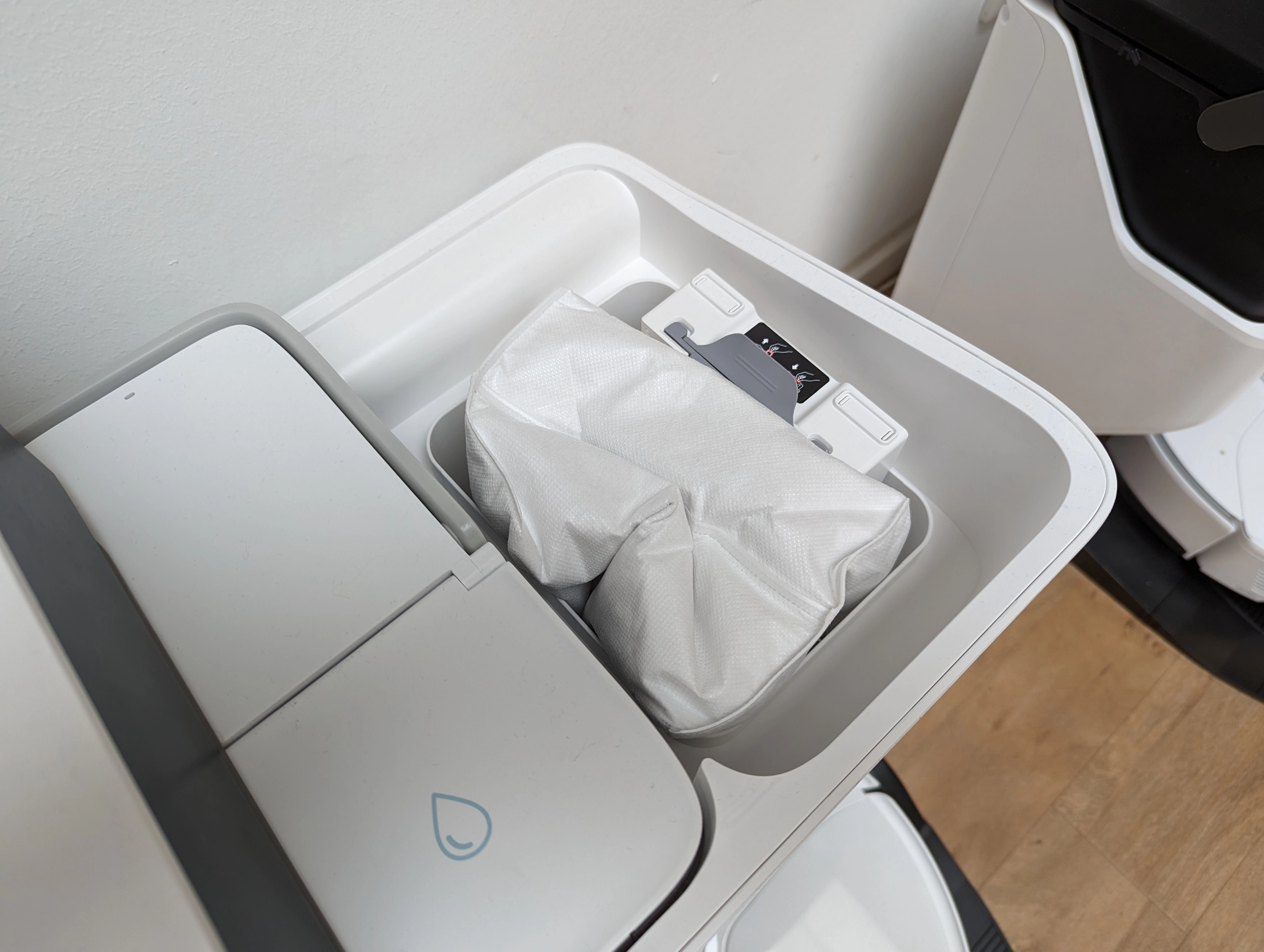 Roborock S8 Pro Ultra поставляется с одним мешком для мусора, установленным в станцию, и одним запасным мешком. В этот мешок перемещается весь мусор из пылесоса после уборки. По сравнению с Roborock S7 это шаг назад. В прошлой версии пользователь мог выбирать между циклонным фильтром и мешком, здесь нам выбора не оставили. Не всем пользователям нравятся пылесосы с мешками, которые приходится регулярно покупать.