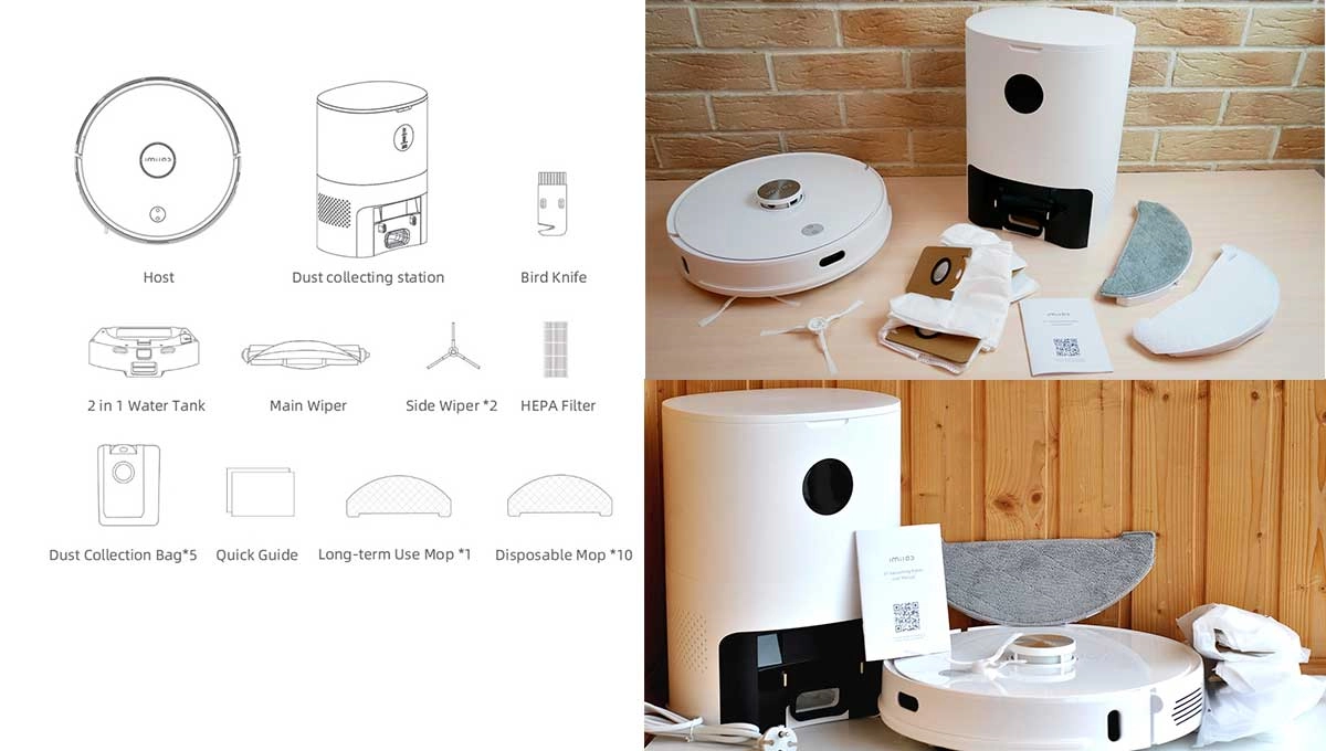 Пылесос поддерживает сухую и влажную уборку, а также самостоятельно очищает контейнер с пылью после уборки, поэтому комплектация у него соответствующая: