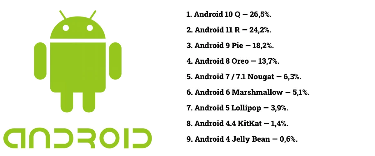 Согласно ее данным, на первом месте находится Android 10 с долей 26,5% и ей на пятки наступает Android 11 у которой 24,2%. Android 9 все еще используют 18,2% пользователей, Android 8 — 13,7%.
