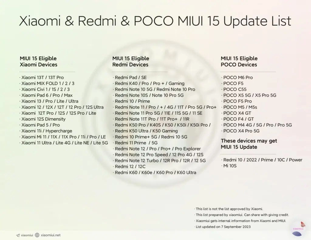 В августе 2023 года компания Xiaomi анонсировала скорый выход MIUI 15. Показала ее пользовательский интерфейс, но оставила в секрете функционал. Официально Xiaomi еще не сообщила о том, какие же именно устройства получат обновление, но ресурс Xiaomiui, основываясь на своем многолетнем опыте, подготовил список устройств, которые могут получить MIUI 15.