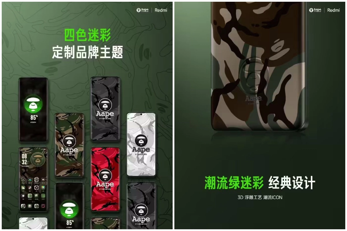 Одновременно с выходом базовой версии Redmi Note13 Pro+ бренд представил еще и лимитированное специальное издание, которое разрабатывалось совместно с производителем одежды AAPE. Дизайн цвета хаки с камуфляжными вставками, тематическими обоями, стилизованной коробкой и аксессуарами в комплекте. На тыльной стороне смартфона есть тиснение с названием бренда AAPE.