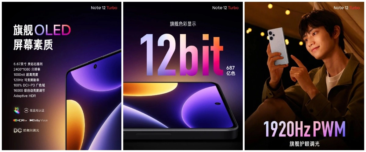 Redmi Note 12 Turbo получил 12-битный OLED-дисплей с диагональю 6,67", разрешением 2400 х 1080 пикселей, пиковой яркостью до 1000 нит, 100% охватом DCI-P3 и частотой обновления 120 Гц. Поддерживаются технологии Dolby Vision и HDR10 +. Дисплей получил ультратонкие рамки и занимает 93,4% фронтальной плоскости. Вырез камеры расположен по центру.