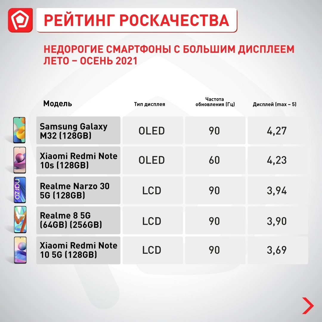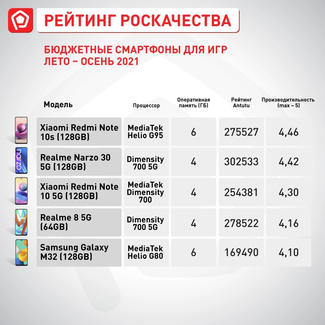 На первом месте Samsung Galaxy M32, а на втором месте с минимальным отрывом Redmi Note 10S.