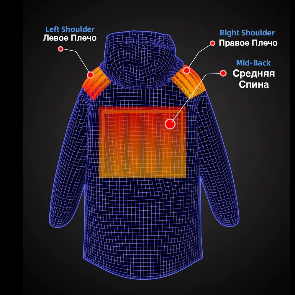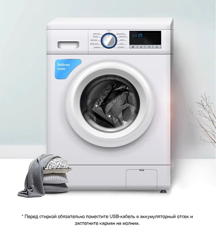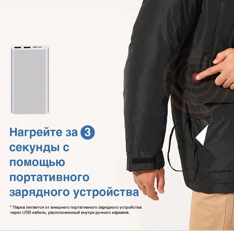 С виду куртка выглядит совершенно обычным предметом одежды. Это полноценная куртка, в которой тепло и без дополнительных функций, если вы находитесь в движении и на улице небольшой минус. Но стоит вам ощутить холод, как на выручку придут встроенные нагревательные элементы. Как правило, они располагаются на спине и плечах и представляют из себя тонкую пленку из углеродного волокна. Питаются эти элементы от пауэрбанка, для которого предусмотрен специальный кармашек с выведенным кабелем подключения. Powerbank в комплект не входит, поэтому его необходимо приобретать отдельно.