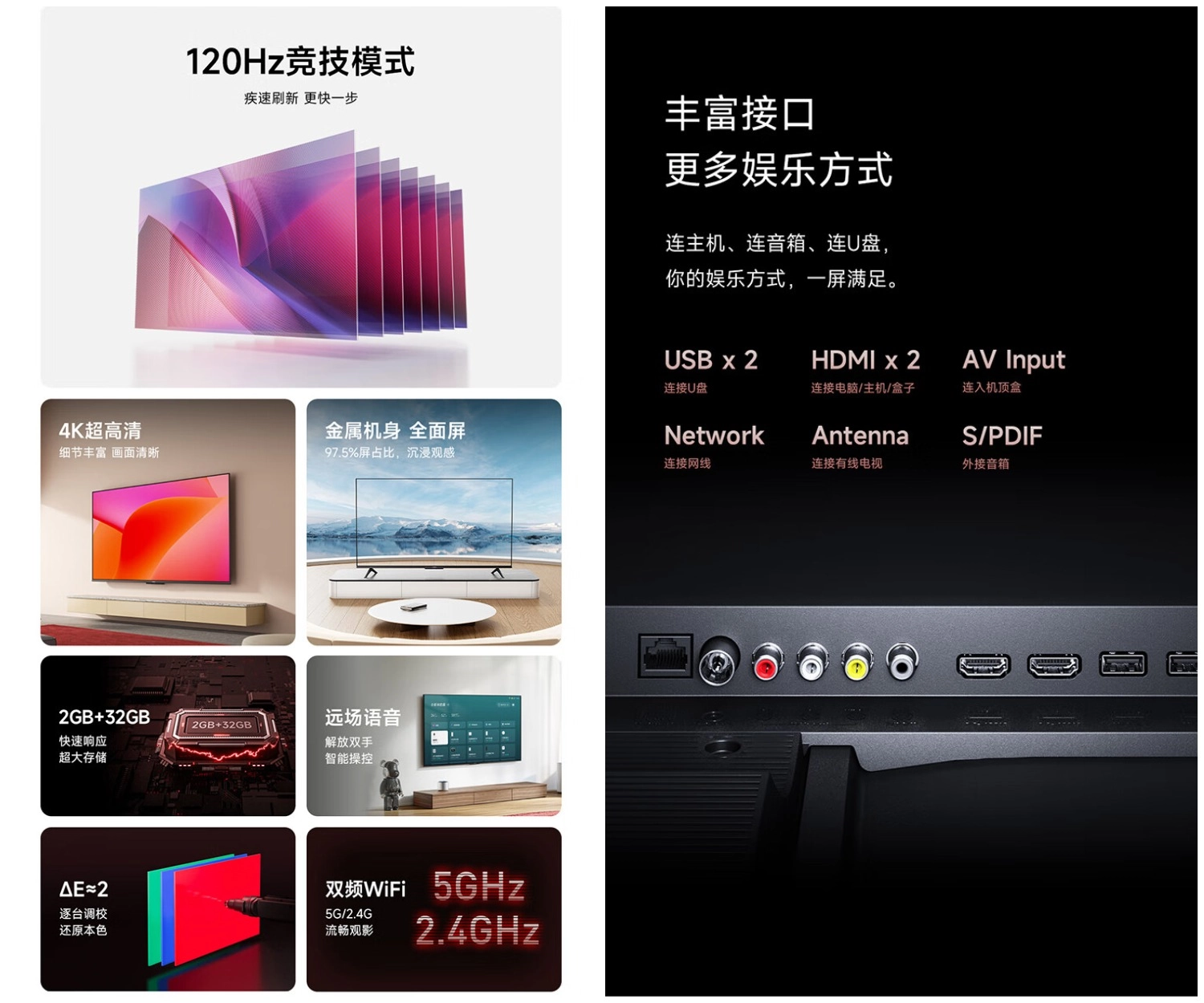 Телевизоры получили ультратонкие рамки и металлический корпус. Соотношение экрана к корпусу 97,5%. У обоих моделей разрешение 4K и частота обновления экрана 120 Гц.