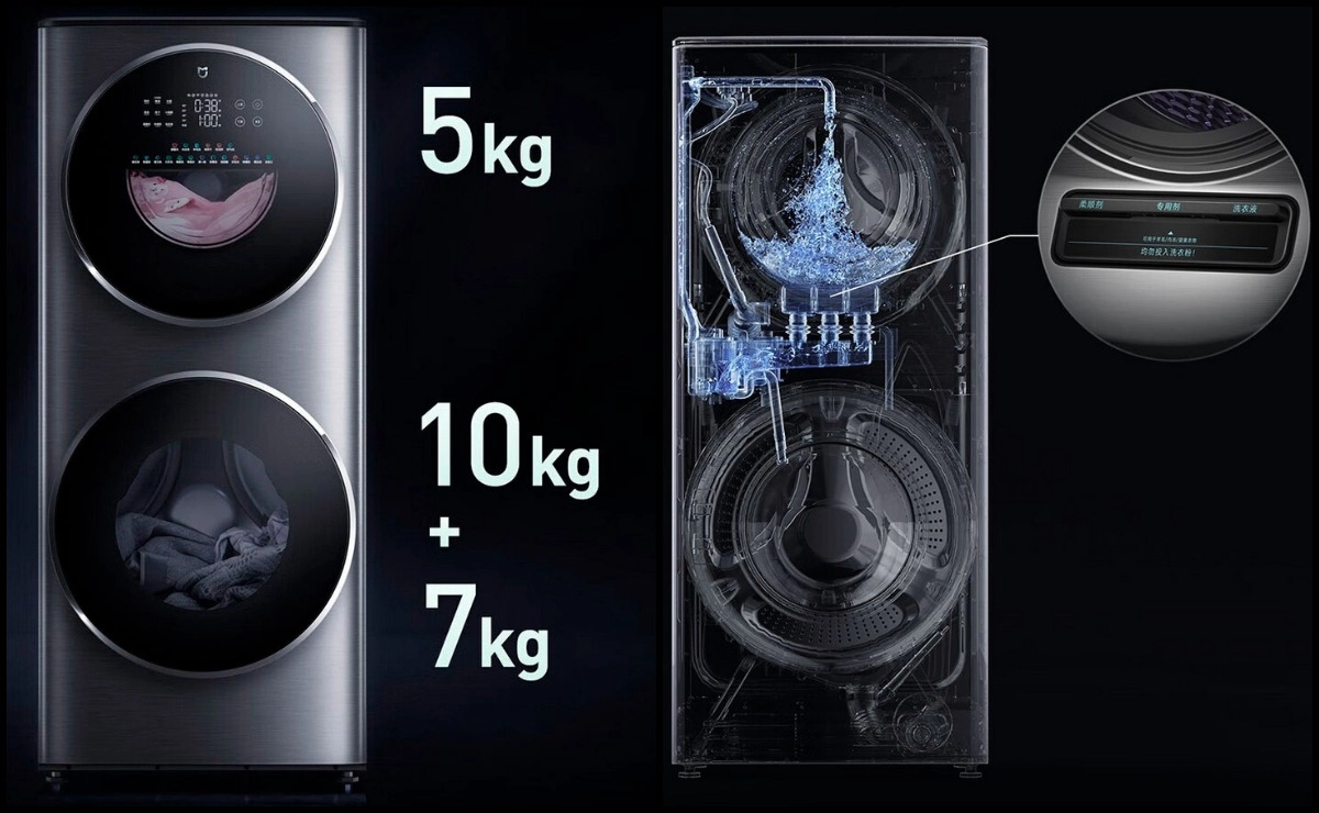 У нас появилась очень интересная новинка — стиральная машина Xiaomi Mijia Partition Washing Drying Machine 15 кг. Ее главная особенность в наличии двух барабанов для стирки и дополнительной опции сушки белья.