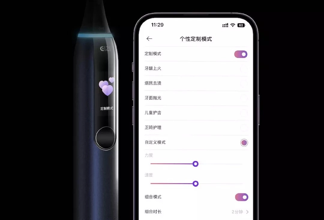 Во время чистки зубов умная щетка автоматически выбирает скорость в зависимости от силы нажатия. Если пользователь слишком сильно давит на щетку, то загорается красный индикатор, а скорость двигателя замедляется на 3 секунды.