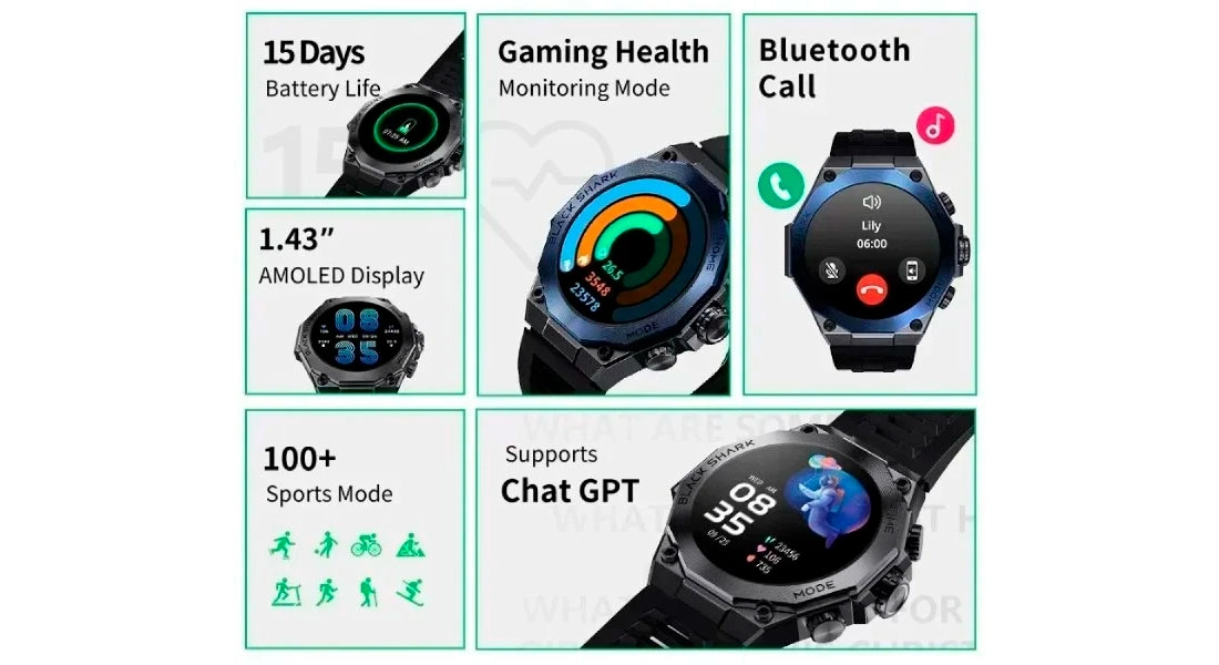 Ключевой особенностью Black Shark S1 Pro стала поддержка ChatGPT. Умные часы способны давать ответы на вопросы пользователя, но для корректной работы функции поблизости должен находиться сопряженный смартфон. Как и положено умным часам Black Shark S1 поддерживают голосовые звонки через Bluetooth, есть поддержка 100+ спортивных режимов, большой выбор цифровых дисплеев.