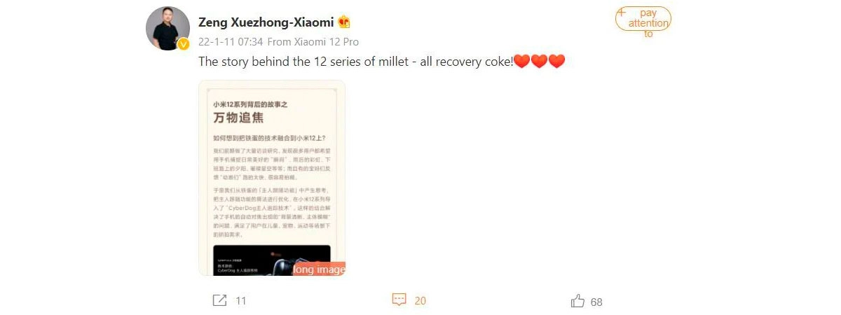 Старший вице-президент компании Цзэн Сюэчжун на своей страничке в Weibo рассказал о том, как технология КиберФокус, используемая в собаках-роботах Xiaomi, нашла свое применение в новом смартфоне Xiaomi 12.