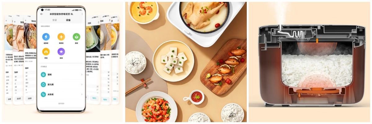 Mijia Smart Quick Cooking Rice Cooker 5L имеет мощность 860 Вт и готовит рис за 28 минут. Для тех, кому мало одного риса умная машина предлагает три тысячи рецептов с его участием.