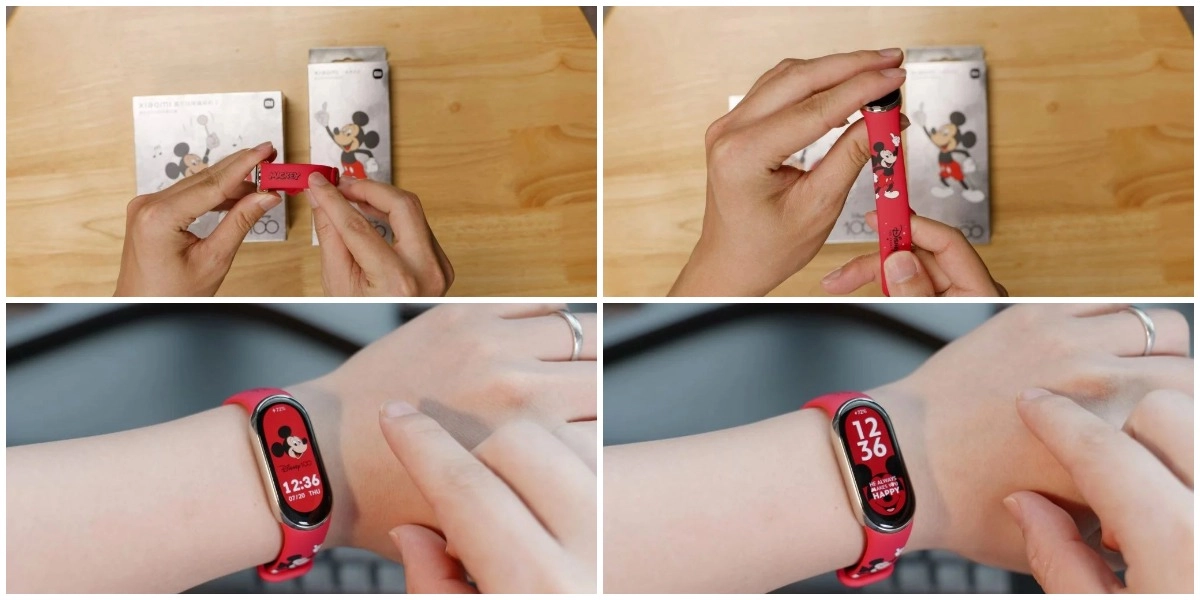 Внутри упаковки находятся еще одни наклейки. Сам браслет ничем не отличается от массовой версии, но вот ремешок однозначно притягивает взгляд — яркий красный, с веселым Микки Маусом и надписью Disney 100. В браслете предустановлено несколько вариантов циферблата ограниченной серии с Микки.