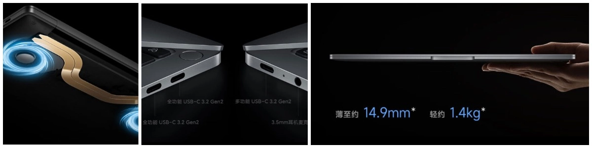 Среди особенностей моделей — ураганная система охлаждения с двумя кулерами и двумя теплоотводящими трубками. У Xiaomi Notebook Pro 14 всего 4 разъема — один для подключения внешних колонок или наушников и три универсальных USB Type-C второго поколения.