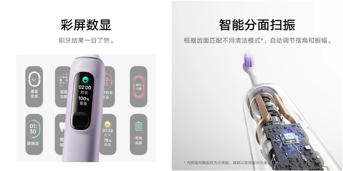 Mijia Sonic Vibration Electric Toothbrush Pro стала первой зубной щеткой бренда с цветным дисплеем, на котором отображается процесс очистки. Щетка оснащена специальным шестиосевым датчиком, который контролирует положение зубной щетки и угол наклона. Также щетка самостоятельно регулирует силу вибрации и ее амплитуду.