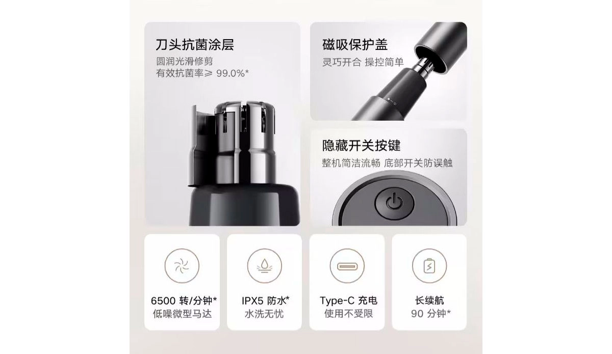 Отличительной особенностью триммера стала режущая головка с антибактериальным покрытием, эффективность которого достигает 99%. Триммер оснащен съемным острым лезвием, которое аккуратно снимает волоски, не травмируя чувствительную слизистую.