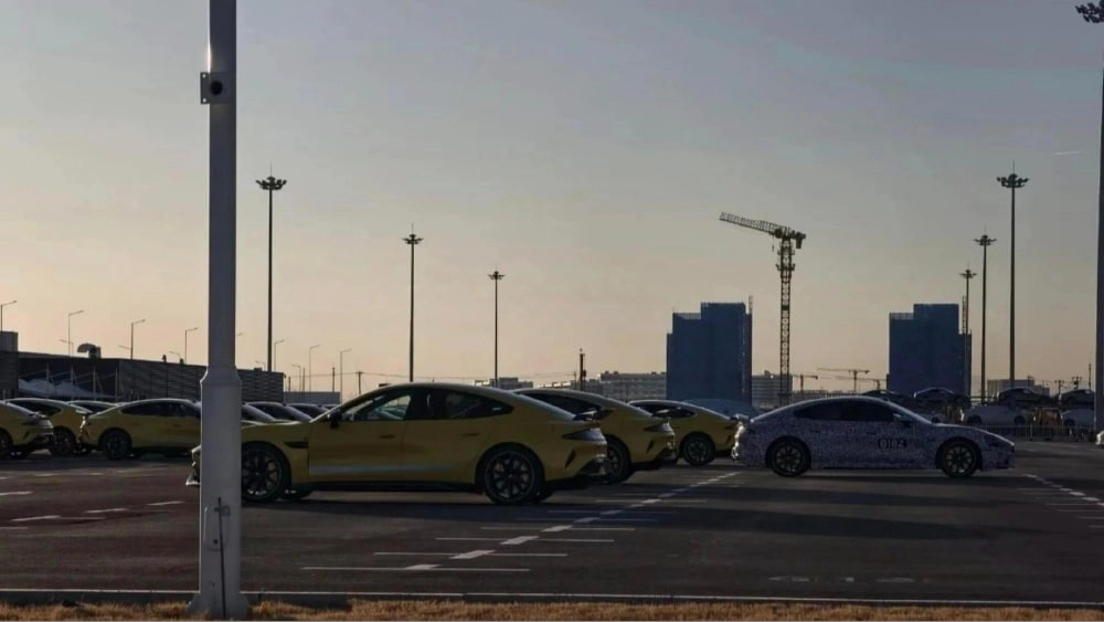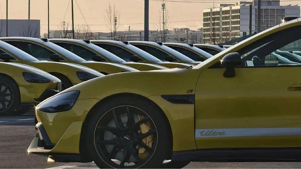На кадрах с завода видно несколько десятков SU7 Ultra. Модель легко узнать по спортивному переднему бамперу с антикрылом, увеличенным тормозам, эксклюзивному желтому цвету кузова и белым полосам с надписью «Ultra». Также автомобиль выделяется крупным задним спойлером и слегка расширенным кузовом.