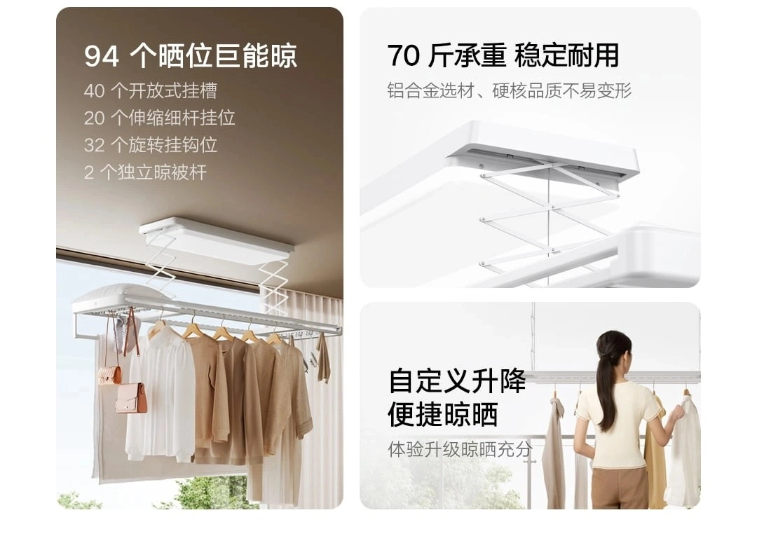 В конструкции используются прочные материалы: штанги выполнены из алюминия марки 6063, а тросы — из нержавеющей стали 304. Устройство выдерживает до 35 кг нагрузки и предлагает целых 94 точки для развешивания белья: 40 открытых пазов, 20 телескопических штанг, 32 поворотных крючка и 2 отдельные штанги для одеял. Система оснащена бесшумным электромотором постоянного тока, обеспечивающим плавный и тихий подъём и опускание.