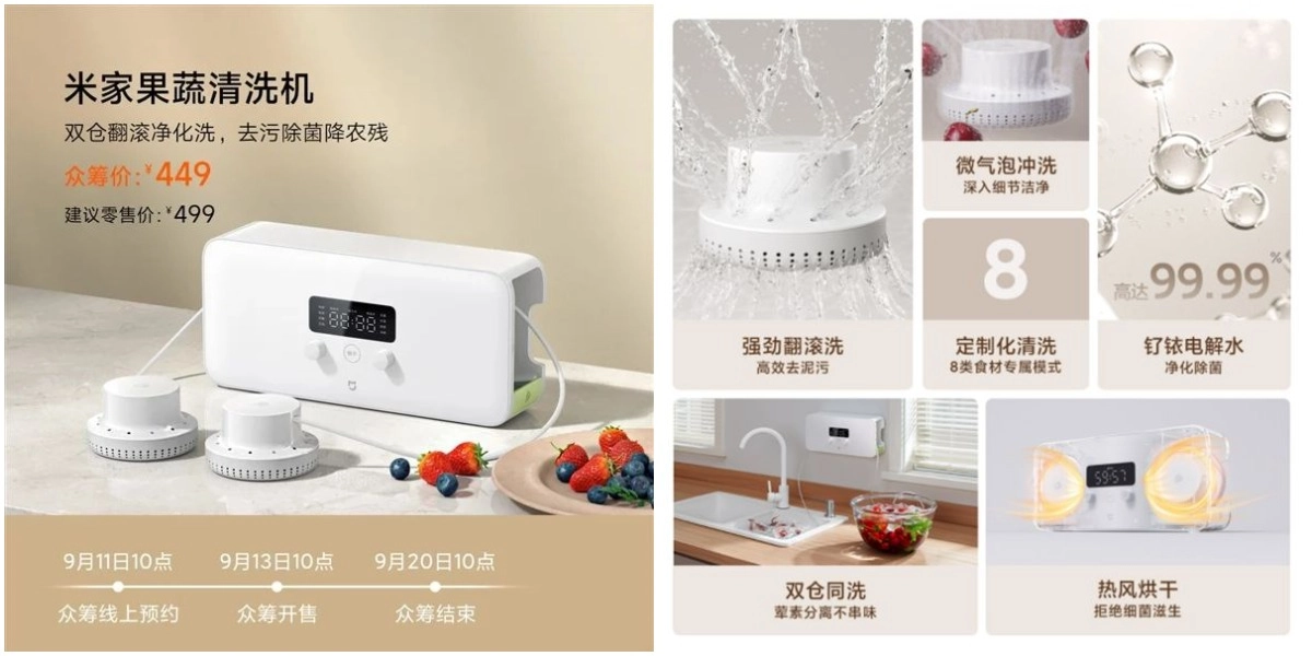 Компания Xiaomi представила устройство для эффективного мытья овощей, фруктов и мяса Mijia Fruit and Vegetable Cleaning Machine. Мойка представляет собой блок, который можно установить на столе или повесить на стену и два выносных модуля для мытья.
