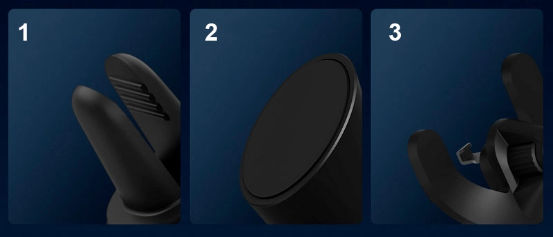 Зажим для плоского воздуховода, крючок для круглого воздуховода или липкий слой для приклеивания держателя к гладким поверхностям, например, лобовому стеклу.