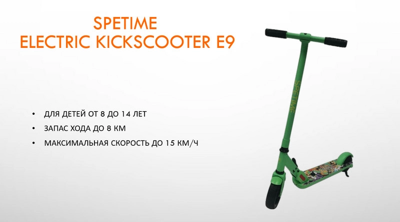 Детский электросамокат Spetime Electric Kickscooter E9 — предназначен для детей от 8 до 14 лет. У него повышенная мощность и скорость до 15 км/ч.