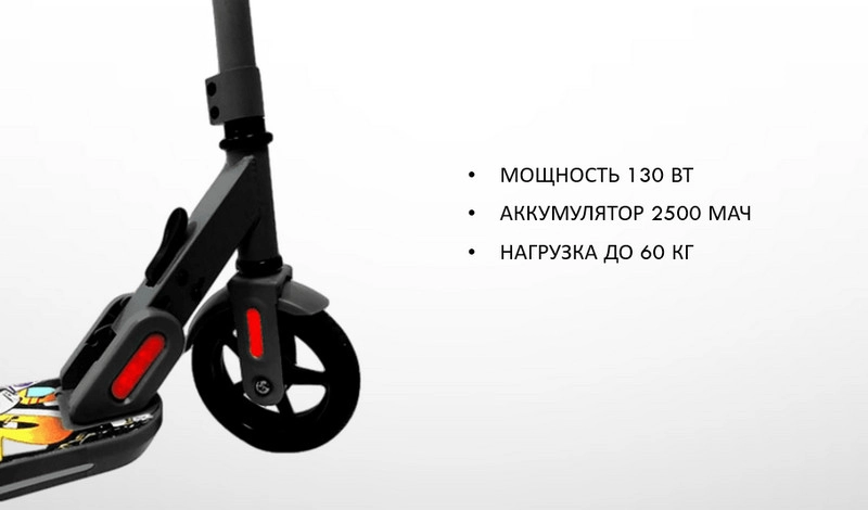 Электросамокат оснащен двигателем мощностью 130 Вт и разгоняется до 15 км/ч. Максимальный вес ездока 60 кг. Встроенный аккумулятор емкостью 2500 мАч обеспечивает запас хода до 8 км.