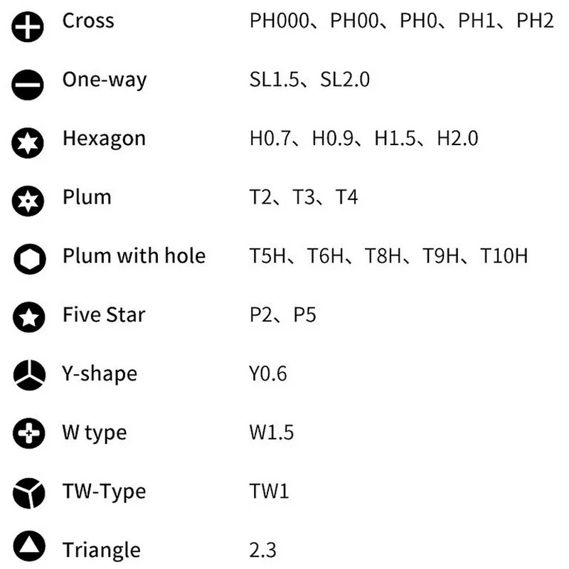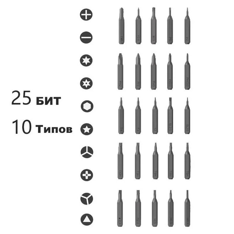 В набор входят 25 бит десяти типов: прямой шлиц, треугольные, шестигранные, наконечник Torx с отверстием и без, пятилучевые, крестообразные. Биты выполнены из прочной легированной стали S2.