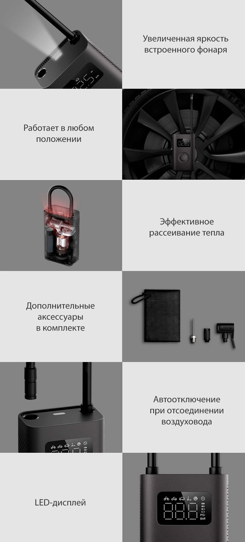 Встроенный аккумулятор был увеличен до 2000 мАч и работает дольше. При накачке шин не требуется подключать отдельный источник питания.