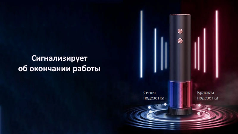В процессе работы штопор светится красным светом, а об открытии бутылки сообщает синяя подсветка.