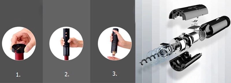 Внутренний двигатель быстро вращается, приводя в действие штопор, который откроет любую пробку всего за 8 секунд.