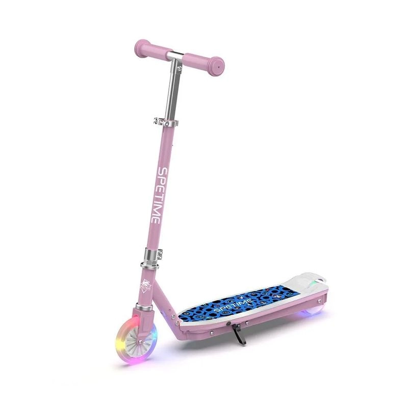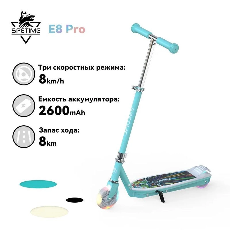 Электросамокат детский Spetime E8 Pro — первый электротранспорт для вашего малыша. Встроенный двигатель включается только в качестве поддержки движения и не разгоняется быстрее 8 км/ч, колеса разного диаметра повышают устойчивость самоката, а яркая RGB подсветка позволит не потерять владельца самоката в темное время суток.