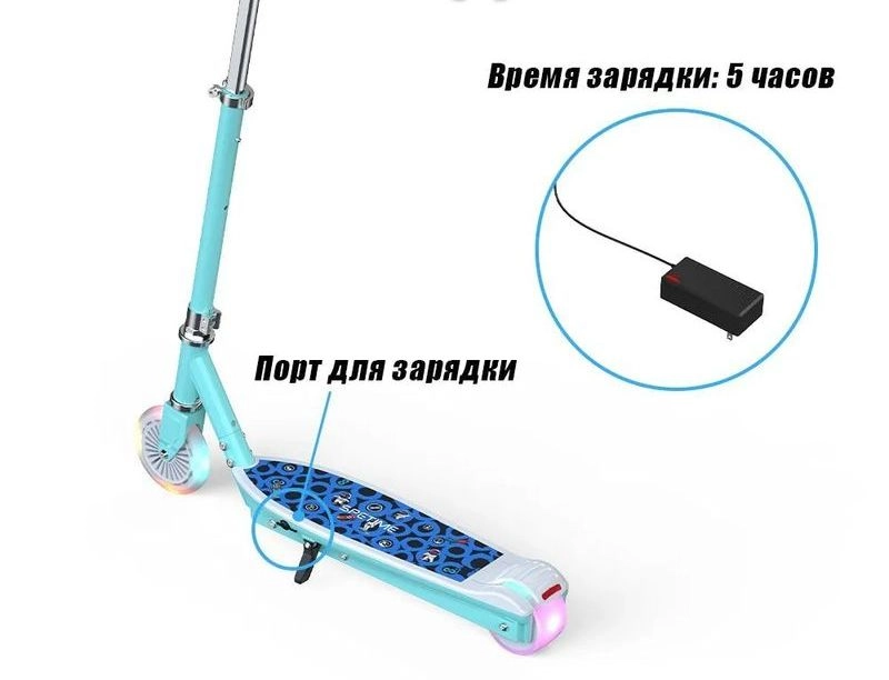 Под декой расположен аккумулятор емкостью 2600 мАч, которого хватает на 8 км пути. Заряжается самокат за 5 часов.