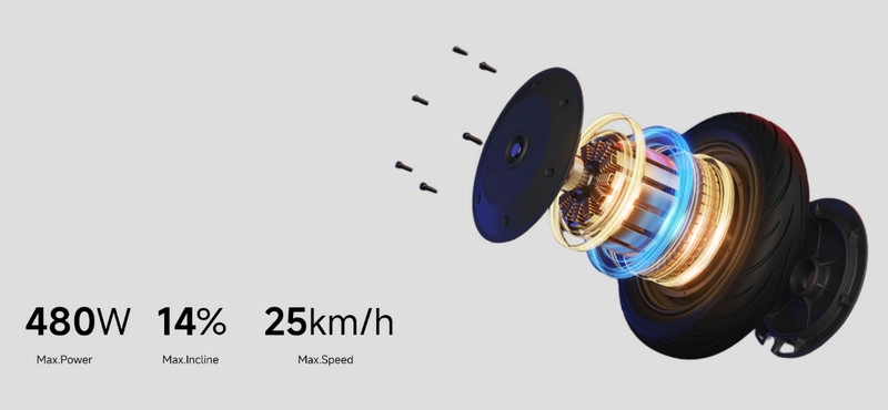 Двигатель мощностью 480 Вт обеспечивает устойчивое движение и позволяет без усилий преодолевать подъёмы до 14%. Максимальная скорость 25 км/ч делает его отличным выбором для активных передвижений по мегаполису.