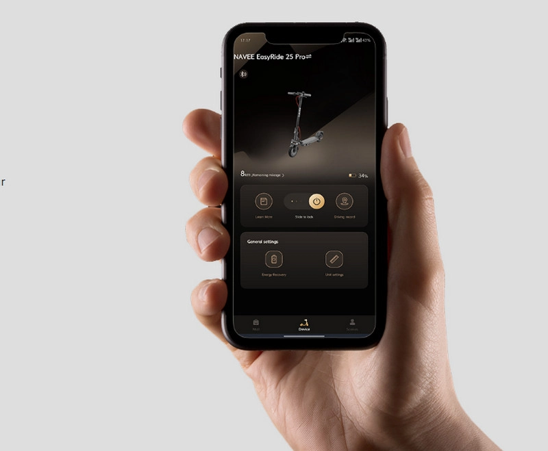 Приложение NAVEE открывает дополнительные функции: блокировка электросамоката, включение фары по датчику освещённости, настройка рекуперации энергии — всё управление — прямо со смартфона.