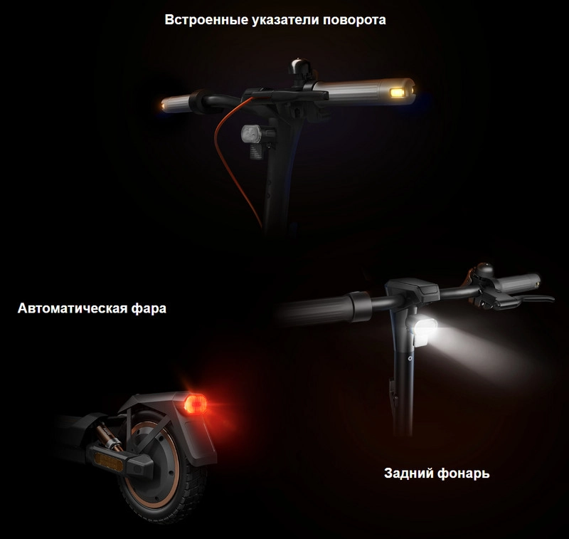Электросамокат оснащён встроенными указателями поворота и интеллектуальными фарами, которые автоматически подстраиваются под освещение, обеспечивая отличную видимость и безопасность как днём, так и ночью, а также плавные и безопасные манёвры.