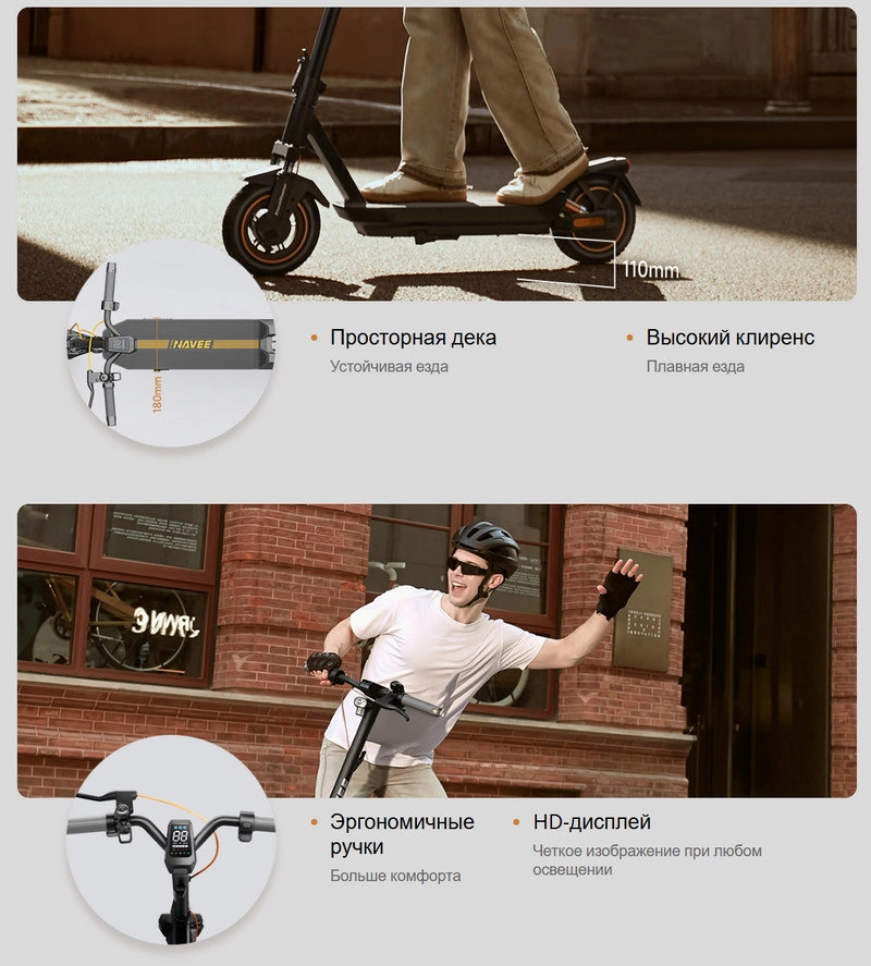 Самокат оснащён эргономичными ручками для удобного хвата, широкой декой и высоким клиренсом для устойчивой и плавной езды, а яркий HD-дисплей обеспечивает отличную видимость информации при любом освещении.