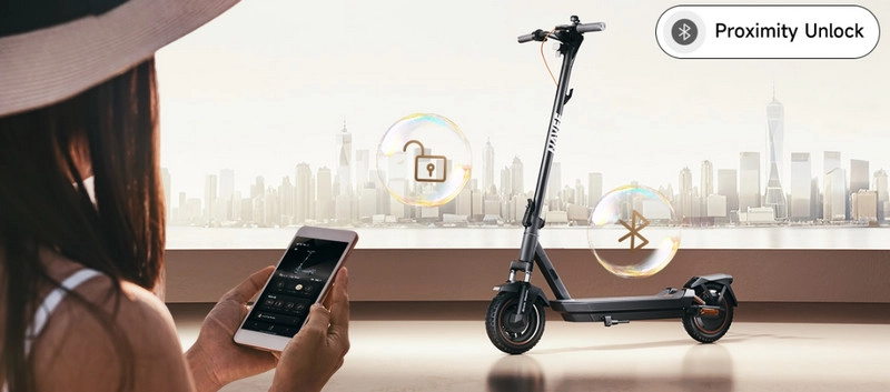 Функция автоматической разблокировки через Bluetooth позволяет начать поездку без лишних действий — просто подойдите к самокату. Когда вы отдаляетесь, система самостоятельно активирует защиту, предотвращая несанкционированное использование.